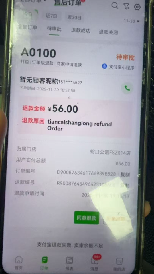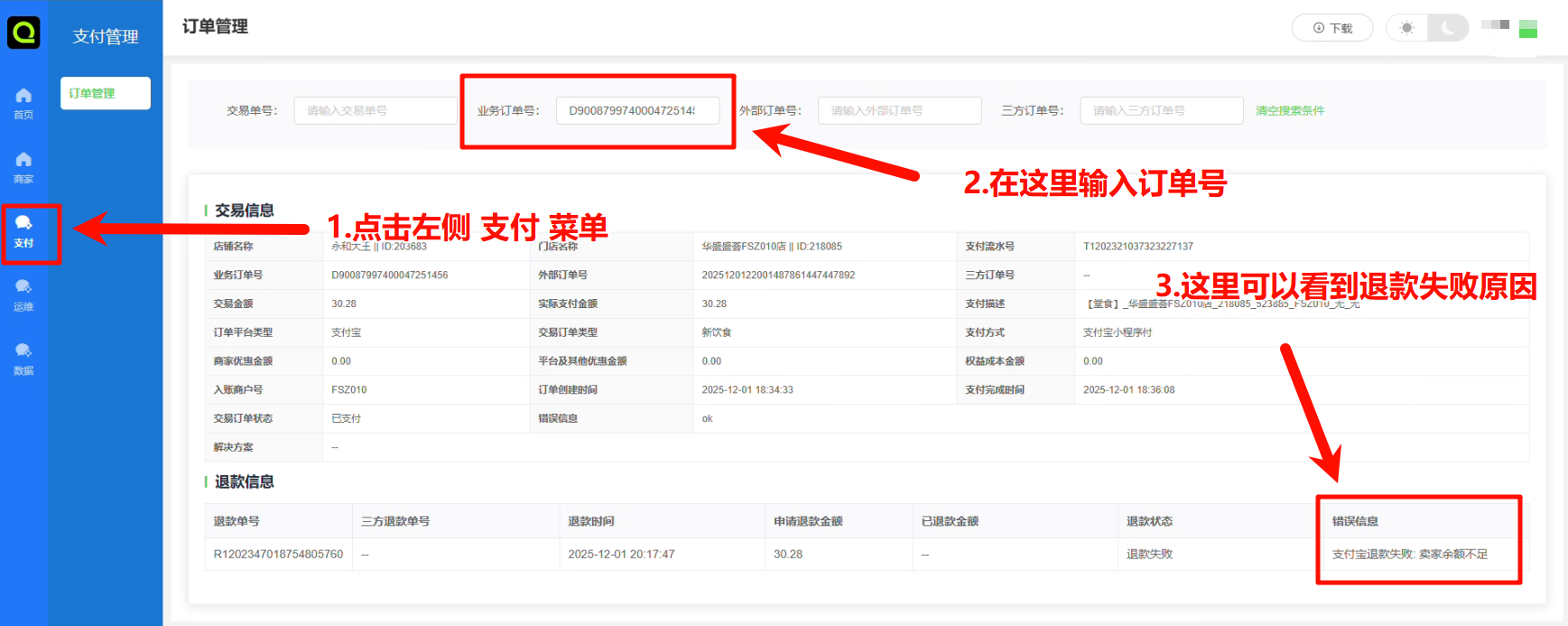 有些门店反馈,为什么已经给顾客操作退款,顾客还是反馈没有收到退款金额? 并且小程序内显示待审批,如下图所示。  出现改问题的原因大部分都是因为:支付宝每笔订单会抽取税点,如果你们支付宝账户余额不足,满足不了退款金额,就会出现退款失败,导致用户收不到退款金额。 具体如何判断原因请按照以下方法进行操作: 以D90087997400047251456该笔订单为例 打开这个链接(需要连接公司内网) https://operating.qmai.cn/homePage 登录你的飞书账号  在图片所示位置就可以看到退款失败原因!