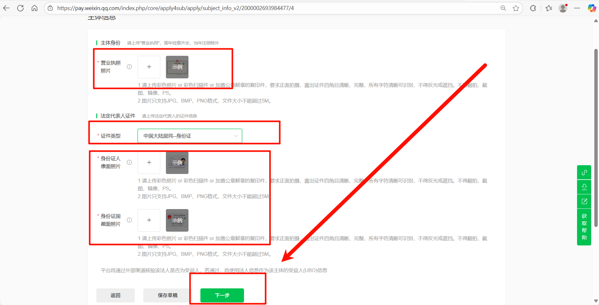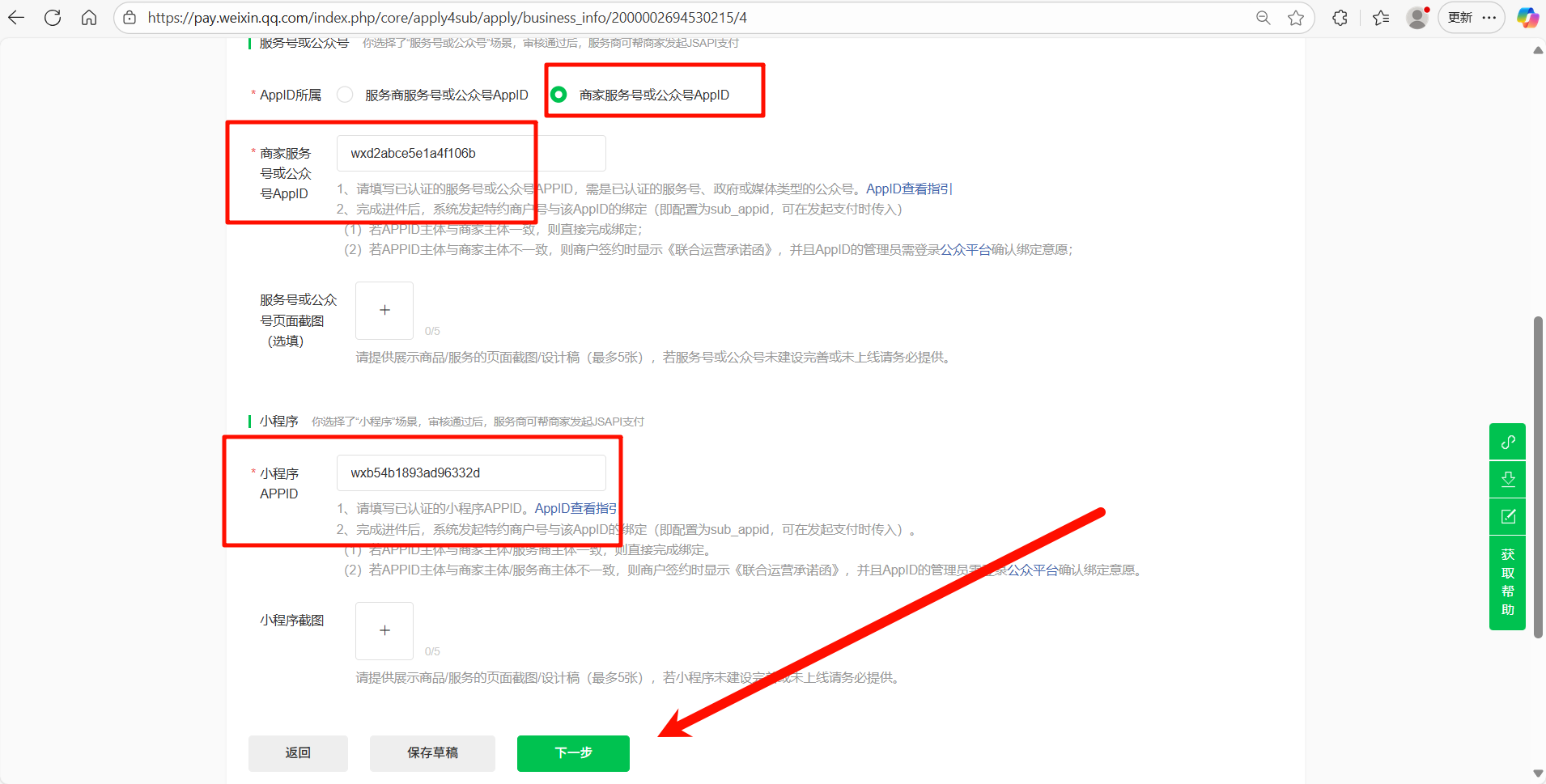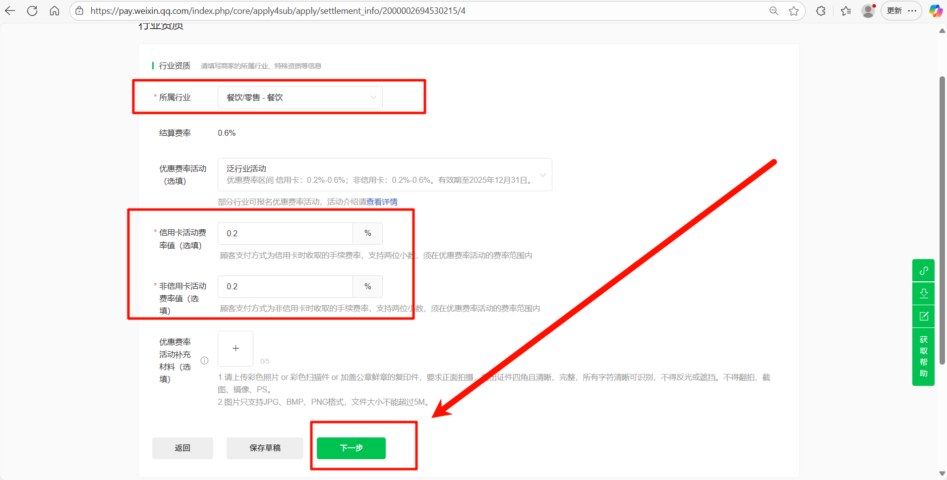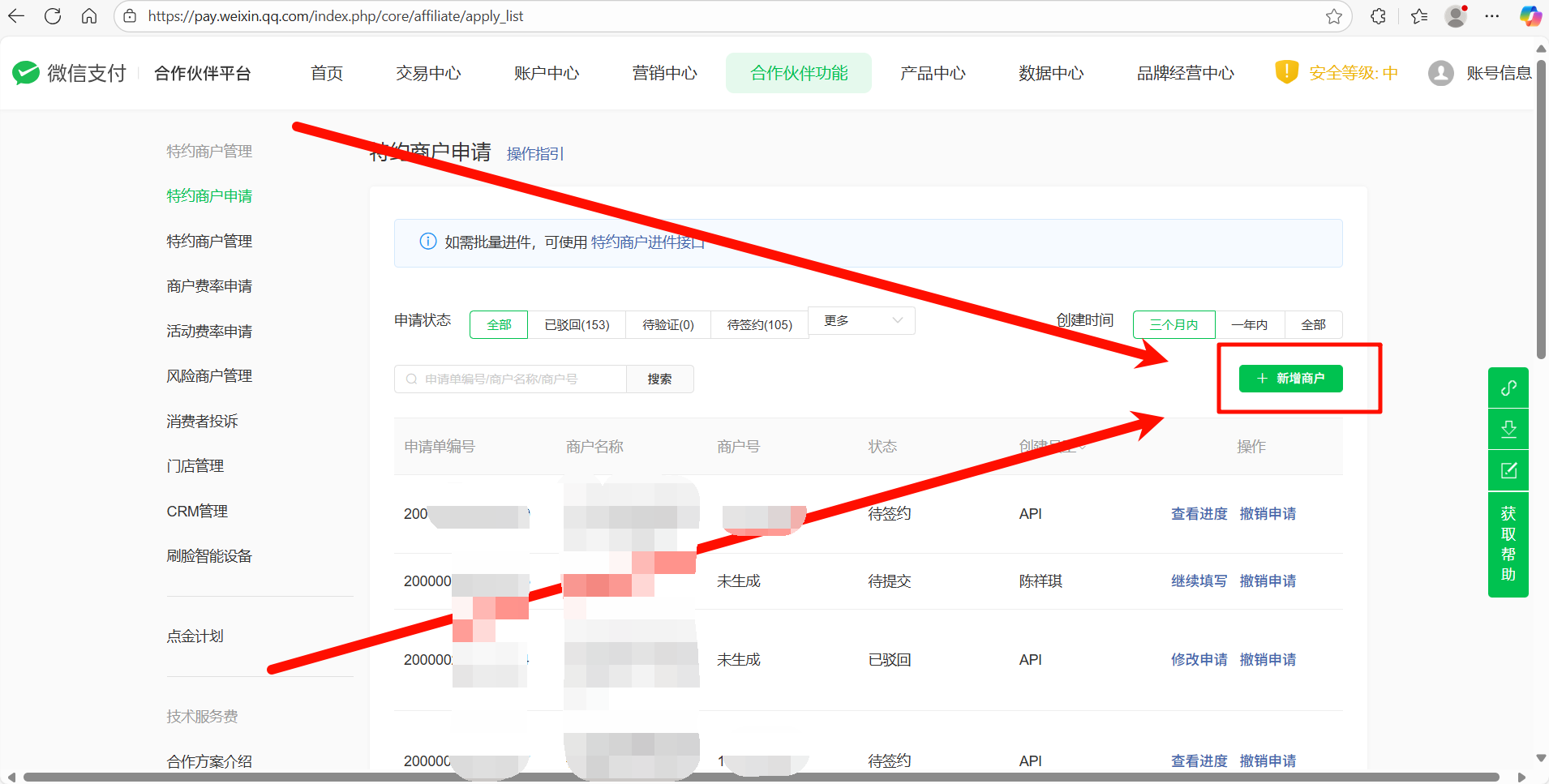1.浏览器打开改网址 https://pay.weixin.qq.com/partner/public/home 2.用你的微信账号扫码登录该网站  3.扫码之后 选择对应的企业即可登录  4.登录之后会跳转到这个页面 点击 顶部 合作伙伴功能  5.在这个页面点击 新增商户  6.根据用户提供的营业执照信息 选择 **个体工商户** 或者 **企业**  7.后续我以个体工商户为例进行演示 点击 个体工商户下面的 选择进入资料填写页面 然后点击 **去填写**  8.根据页面要求和用户提供的资料信息上传**营业执照照片**和**法人身份证照片**然后点击 **下一步**  9.根据用户提供的信息填写如下内容 经营场景选择 **服务号或公众号** 和 **小程序** APPID统一填写为 公众号APPID wxd2abce5e1a4f106b 小程序APPID wxb54b1893ad96332d 然后点击**下一步**   10.所属行业选择 **餐饮/零售-餐饮** 费率统一填写0.2% 如下图所示 填写完成之后点击**下一步**  11.按照用户提供的银行信息填写 个体工商户可以选 **个人储蓄卡** 或者 **对公账户** 企业只可以选 **对公账户** 填写完成之后继续点击 **下一步**  12.按照提供的信息选择 **法定代表人/经营者** 或者 **经办人** 填写完信息之后 继续点击 **下一步**  13.点击提交并预览  14.检查一下信息是否填写正确 没问题就点击 **确定提交**  15.显示此页面之后,申请微信商家支付流程全部结束。